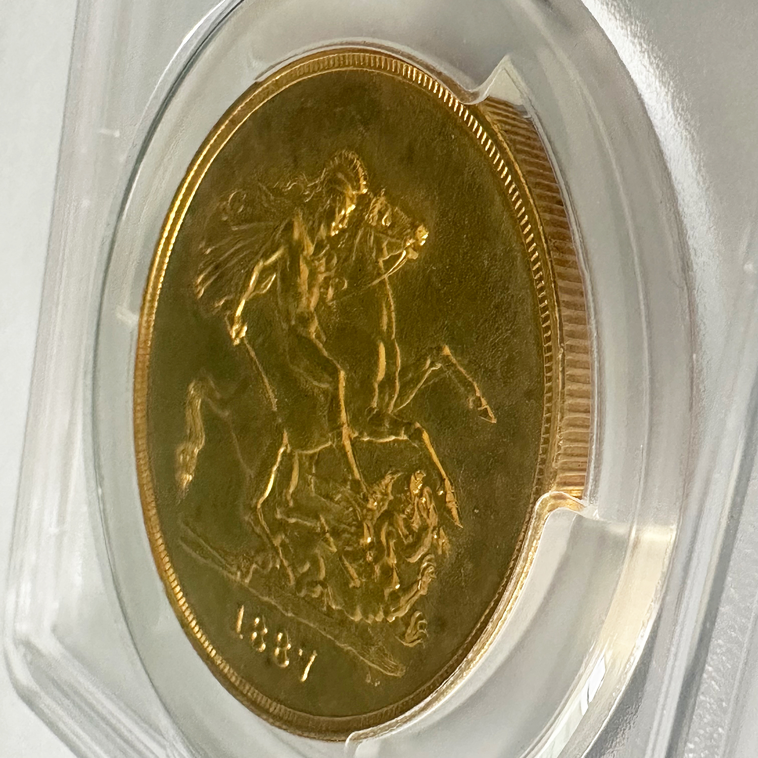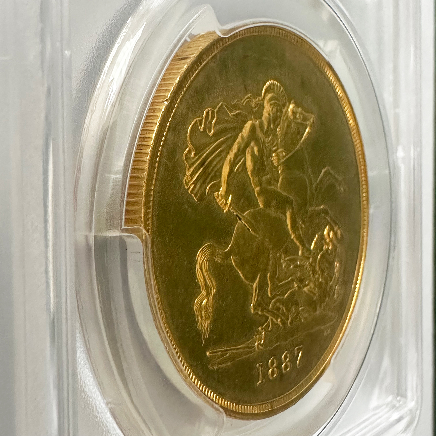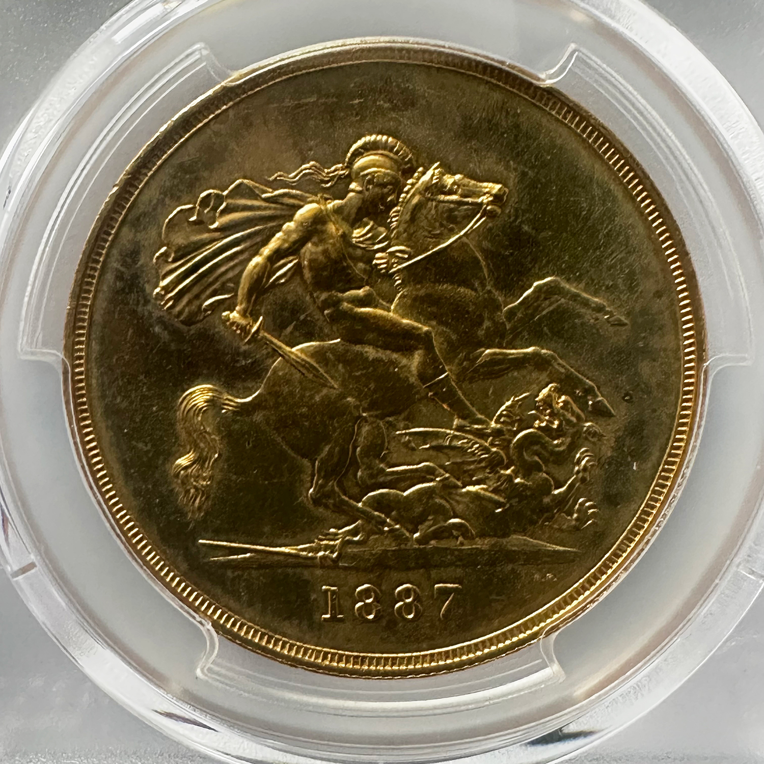 1887年にヴィクトリア女王の即位50周年を記念して発行された「ジュビリーヘッド」デザインの5ポンド金貨は、単年のみの製造で非常に希少性の高い逸品です。正面には王冠を戴いたヴィクトリア女王の横顔が堂々と刻まれ、裏面には聖ジョージの竜退治が描かれる英国コイン伝統の意匠が輝きます。