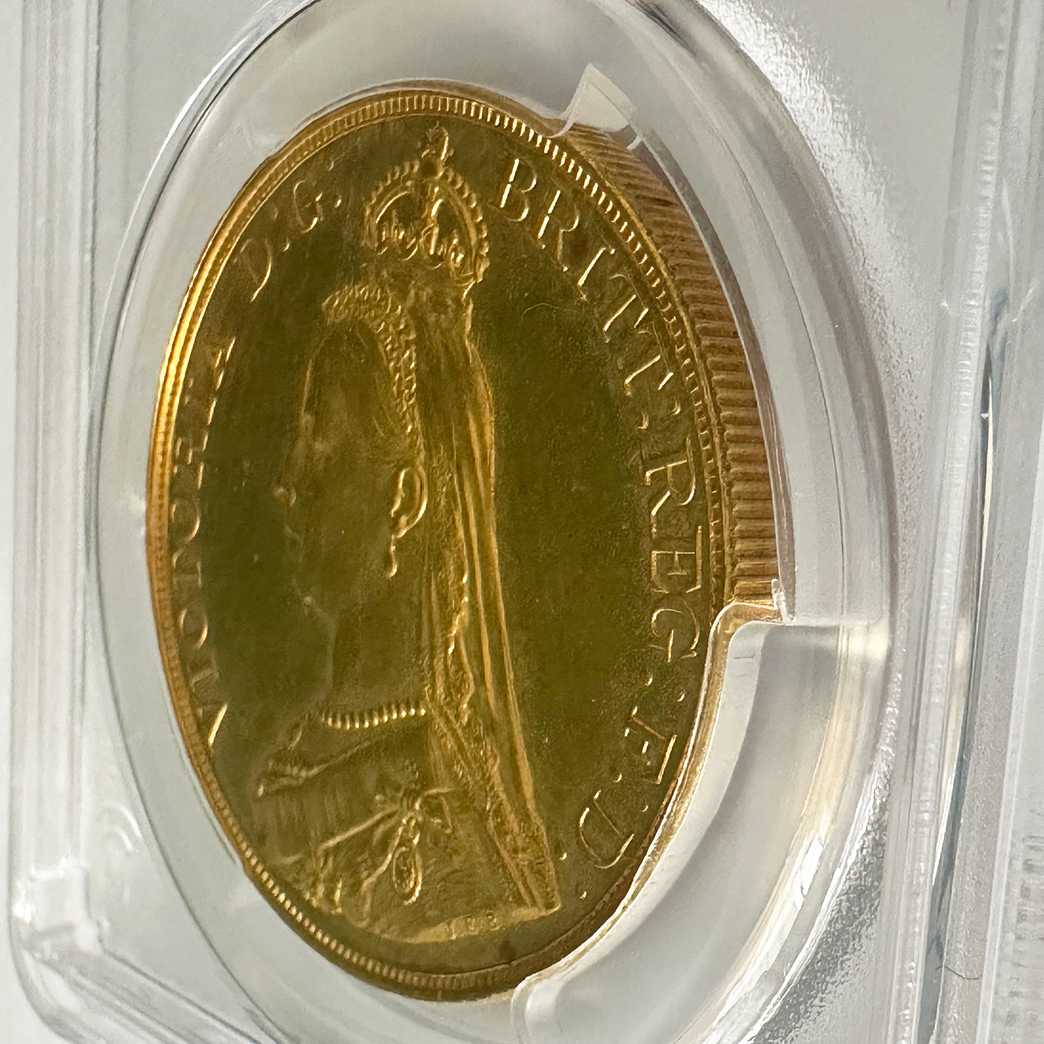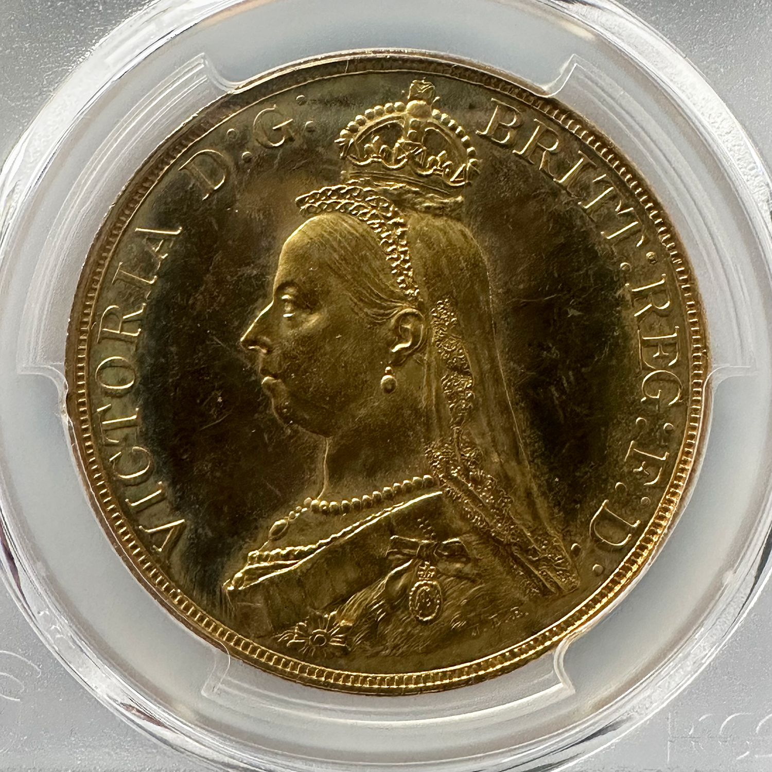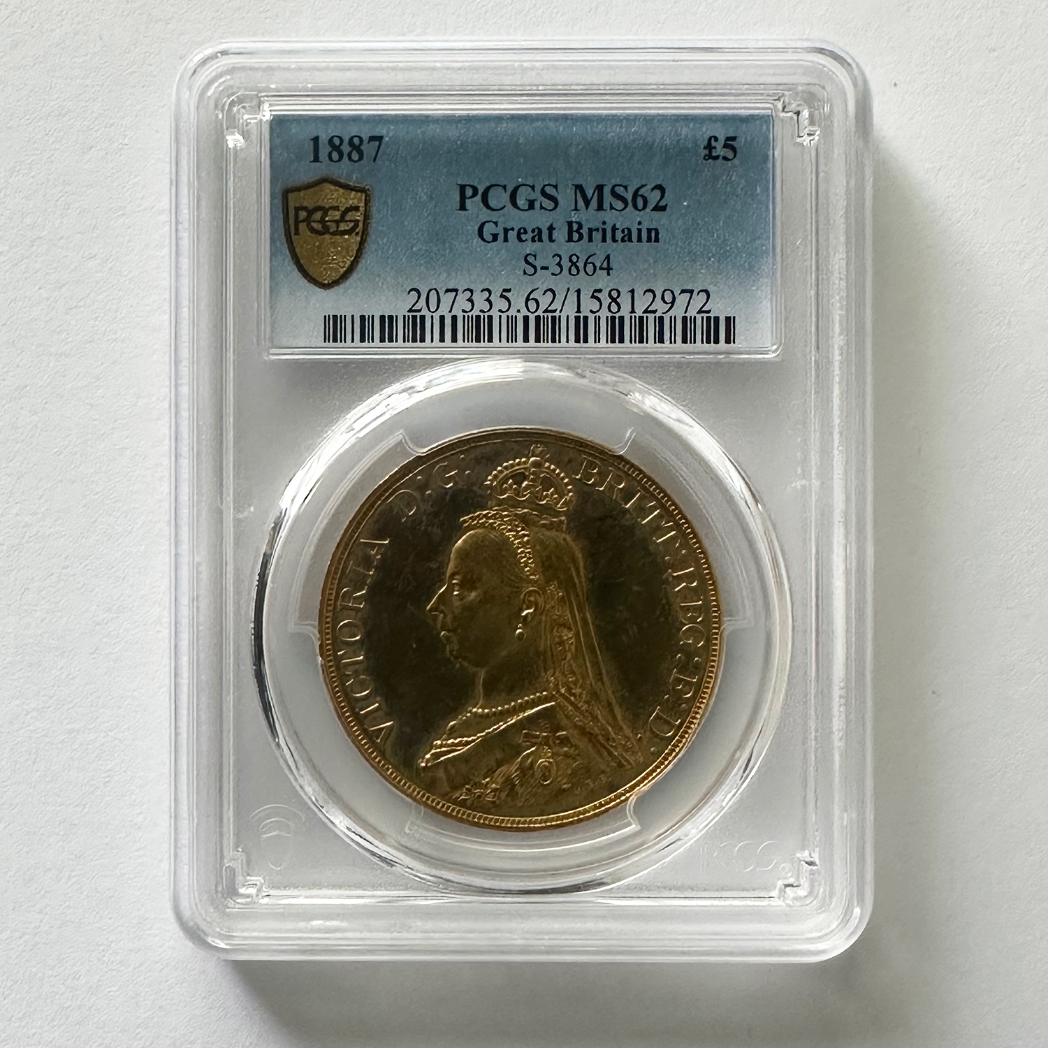 1887年にヴィクトリア女王の即位50周年を記念して発行された「ジュビリーヘッド」デザインの5ポンド金貨は、単年のみの製造で非常に希少性の高い逸品です。正面には王冠を戴いたヴィクトリア女王の横顔が堂々と刻まれ、裏面には聖ジョージの竜退治が描かれる英国コイン伝統の意匠が輝きます。